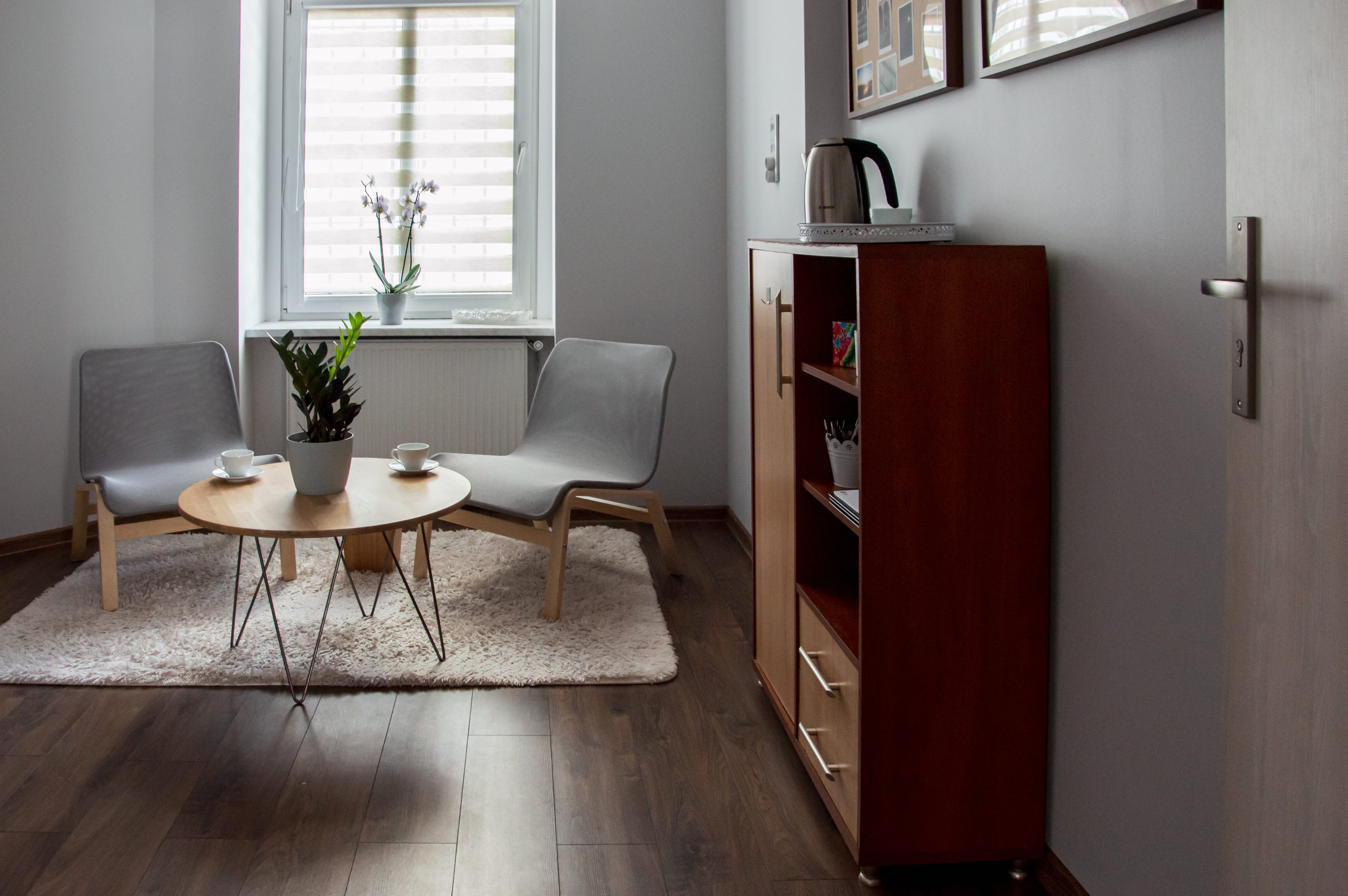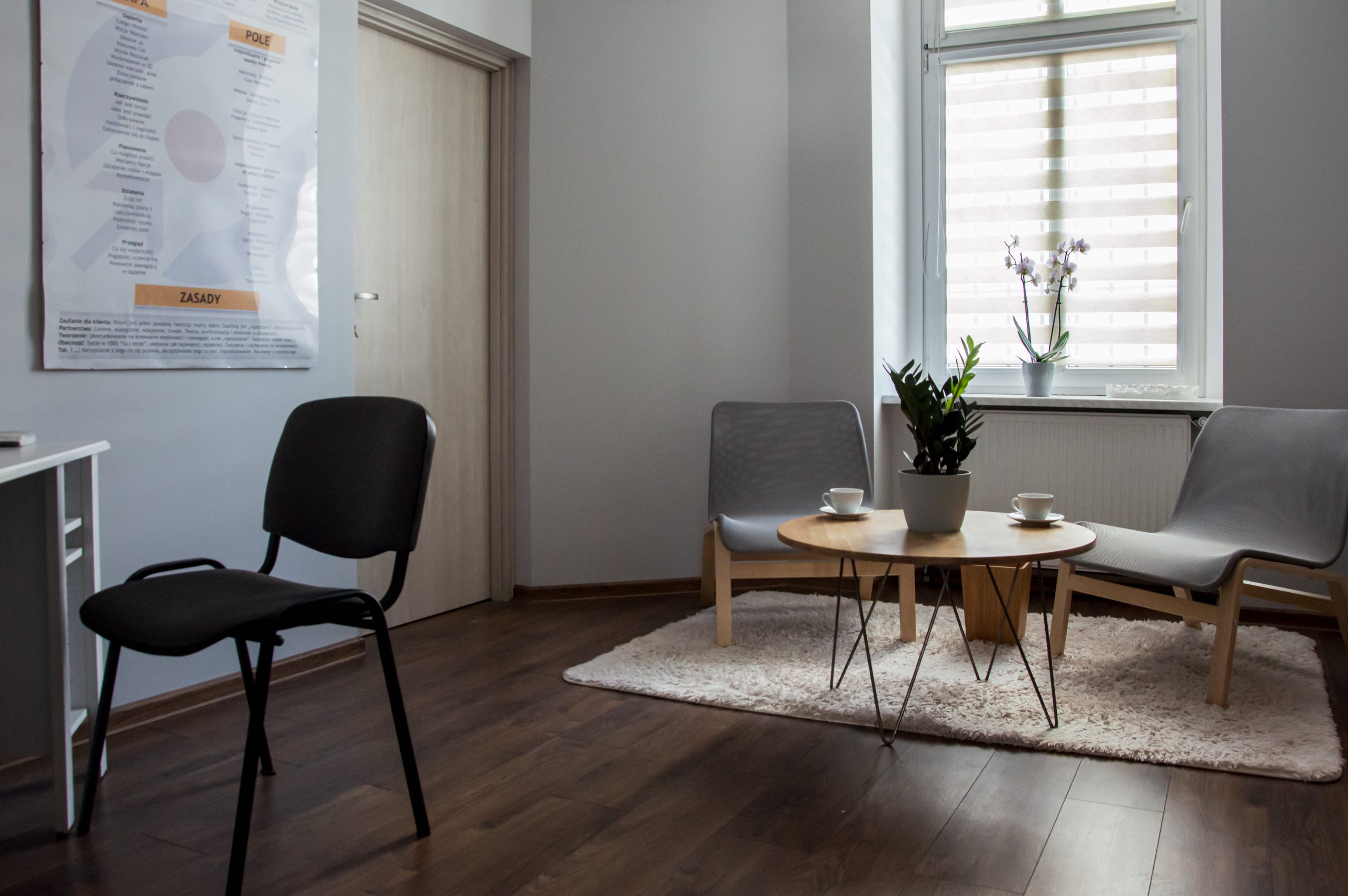 Gabinet zaprojektowany został pod kątem sesji coachingowych, tym samym oferuje klientowi komfort i swobodę spotkań. Wyposażony w wygodne fotele, biurko dla coacha oraz komodę z potrzebnymi artykułami papierniczymi i serwisem kawowym.